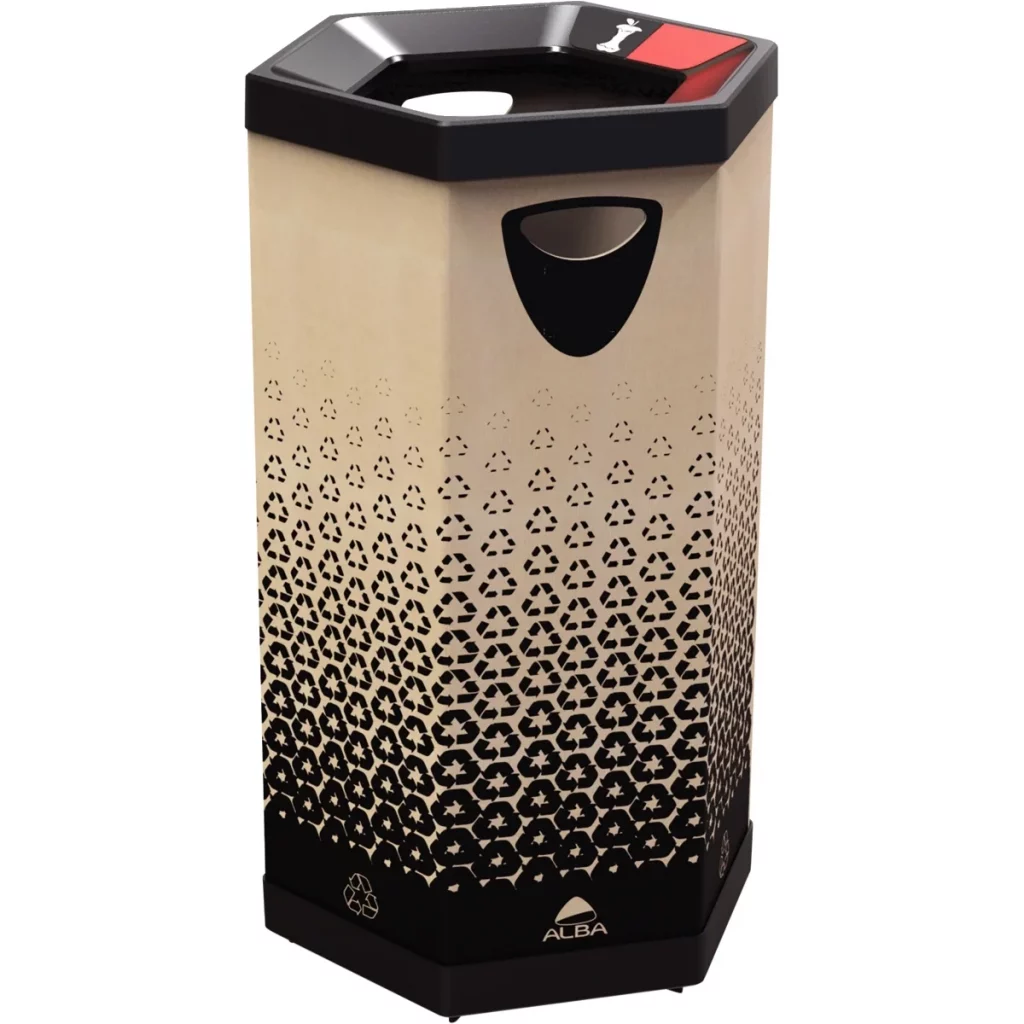 • Tri à la source (5 flux) : Papier/carton, métal, plastique, verre, bois.